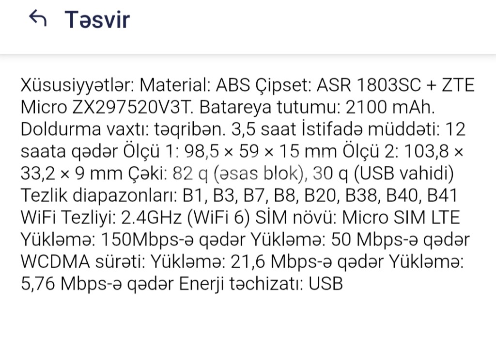 Xüsusiyyətlər: Material: ABS Çipset: ASR 1803SC + ZTE Micro ZX297520V3T. Batareya tutumu: 2100 mAh. Doldurma vaxtı: təqribən. 3,5 saat İstifadə müddəti: 12 saata qədər Ölçü 1: 98,5 × 59 × 15 mm Ölçü 2: 103,8 × 33,2 × 9 mm Çəki: 82 q (əsas blok), 30 q (USB vahidi) Tezlik diapazonları: B1, B3, B7, B8, B20, B38, B40, B41 WiFi Tezliyi: 2.4GHz (WiFi 6) SİM növü: Micro SIM LTE Yükləmə: 150Mbps-ə qədər Yükləmə: 50 Mbps-ə qədər WCDMA sürəti: Yükləmə: 21,6 Mbps-ə qədər Yükləmə: 5,76 Mbps-ə qədər Enerji təchizatı: USB |