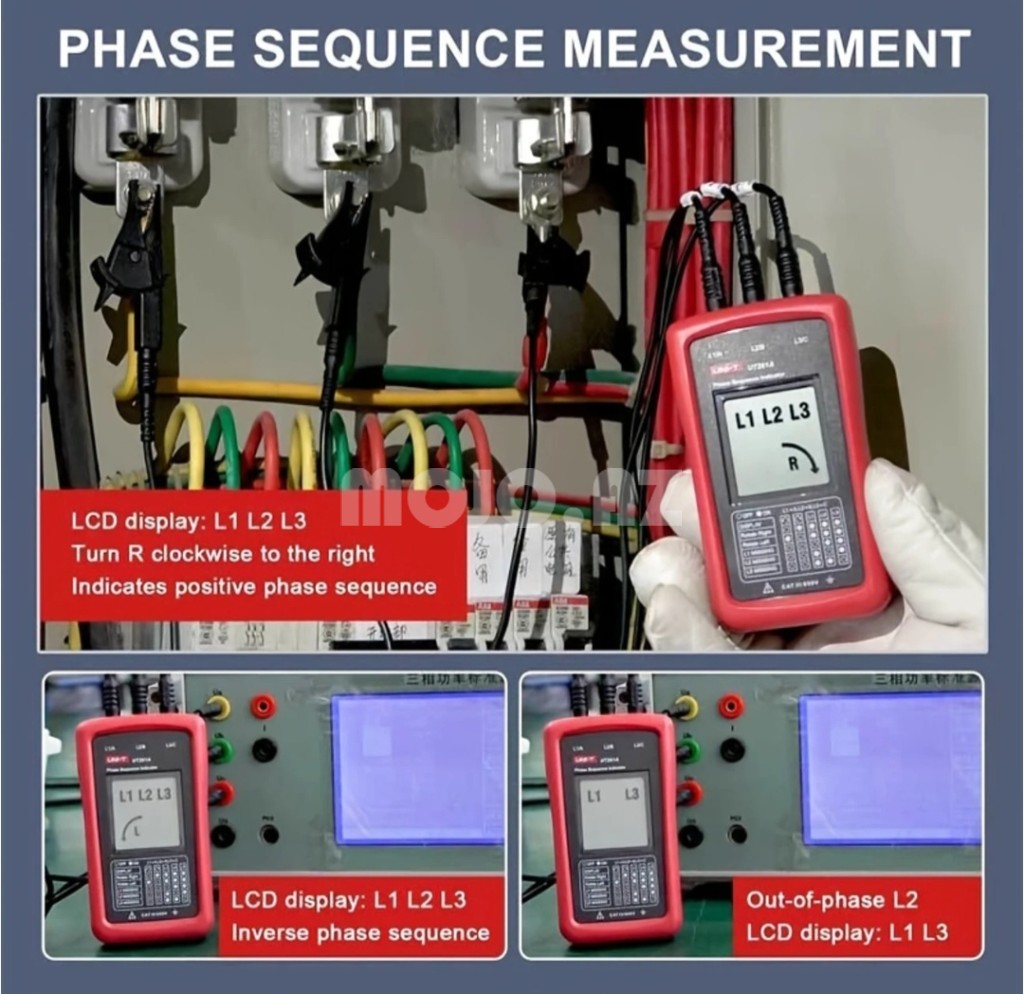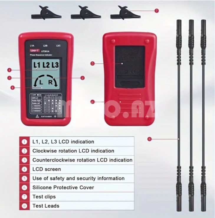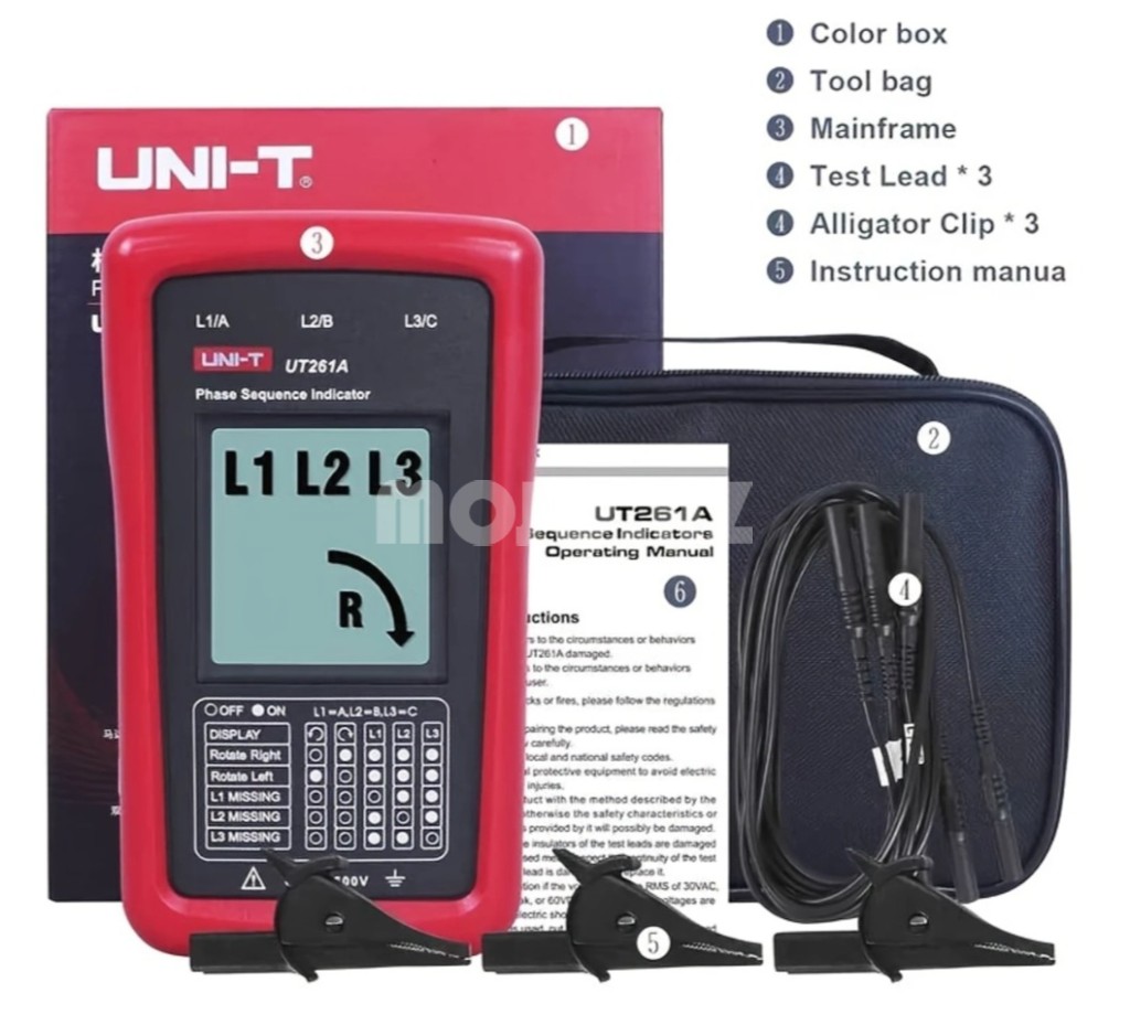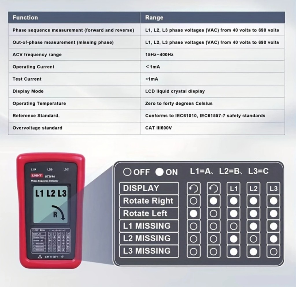 - UT261A üç fazalı enerji təchizatı faza ardıcıllığını aşkar etmək və çatışmayan fazı göstərmək üçün istifadə olunur. 40~690V AC gərginliyini ölçə və 15~400Hz tezlik diapazonunda işləyə bilər.