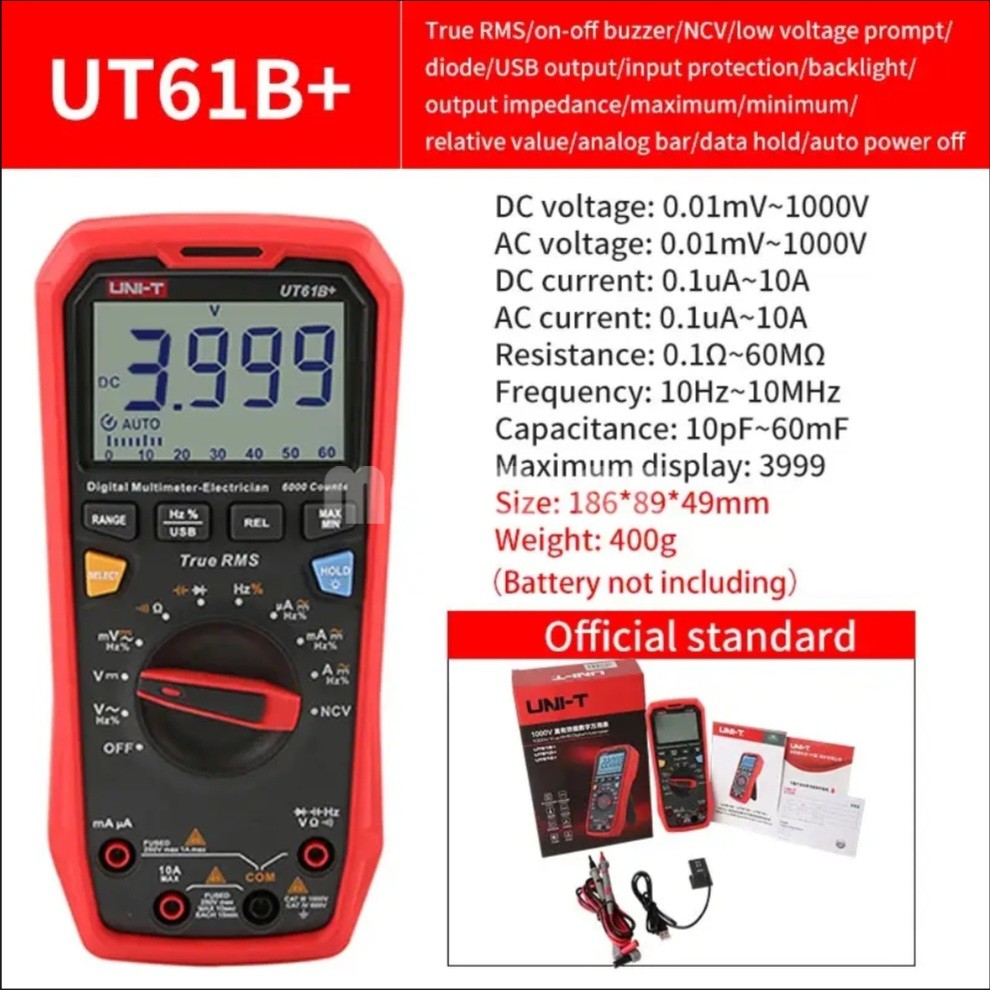 Multimetr. Model: UNI-T UT 61B+ 📌 Xüsusiyyətləri ● Ekran miqyası rəqəmi: 6000 say. ● Ölçmə üsulu: True RMS. ● Analoq miqyas 31 seqment (yeniləmə sürəti saniyədə 30 dəfə) ● Səs və işıq göstəricisi ilə təmassız gərginliyin aşkarlanması (NCV). ● Ölçmə limitlərinin avtomatik seçilməsi. ● Ölçmə limitlərinin əl ilə seçilməsi imkanı. ● Ölçmə tezliyi diapazonu: 40 Hz… ~ 10 KHz ● Sabit gərginlik: 0,01 mV ... 1000 V. AC gərginliyi: 0,01 mV…1000 V ● Müqavimət: 0.1 Ohm…60 MOhm ● Kapasitans: 10 pF ... 60,000 µF ● Sabit cərəyan: 0,1 µA ... 10 A AC cərəyanı: 0,1 µA...10 A ● Tezlik: 0,01 Hz...10 MHz ● Keçiricilik testi: müqavimət ~50 ohm-dan az olduqda işıq və səs siqnalı. ● Diod Testi: Açıq dövrə gərginliyi ~3V ● Ekranın tutulması (HOLD) ● Maksimum, minimum dəyərlərin ölçülməsi rejimi (MAX/MIN) ● Nisbi ölçmə funksiyası (REL) ● Ekranın arxa işığı. ● Nümunə alma tezliyi: 2-3 Hz ● Həddindən artıq yükləmə göstəricisi: LCD displeydə "OL" simvolu. ● Aşağı batareya göstəricisi. ● Işləmə temperaturu diapazonu: 0°C ... +40°C ● Saxlama temperaturu diapazonu: -10°С ... +50°С ● Qoruyucular: 1A/240V; 10A/240V; Ф 6 x 25 mm ● Enerji təchizatı: batareyalar 4 ədəd. x 1,5 V tipli AAA. ● Cihaz ölçüləri: 186 x 89 x 49 mm. ● Cihazın çəkisi: 400 q