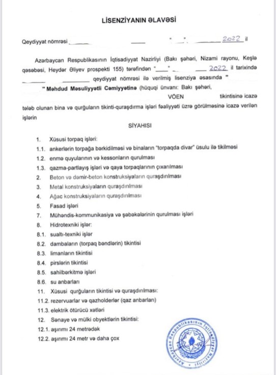 2016-cı ildə rəsmi qeydiyyatdan keçmiş, 2022-ci ildə tikinti-quraşdırma işlərinə aid lisenziya alınmış şirkət satılır. Dövriyyəsi təxminən 600 min manatdır. Heç bir borcu və yaxud öhdəliyi yoxdur. Tenderlərdə iştirak etməyə tam hazırdır. WhatsApp daima aktivdir. Başqa hüquqi xidmətlər və şirkətlər mövcuddur. |