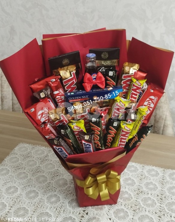 Sokolad buketleri istenilen formada,olcude ve istenilen dizaynda hazirlanir.Sifaris en az 1 gun onceden goturulur.Sifaris ucun whatsapa yaza ve ya zeng ede bilersiniz.