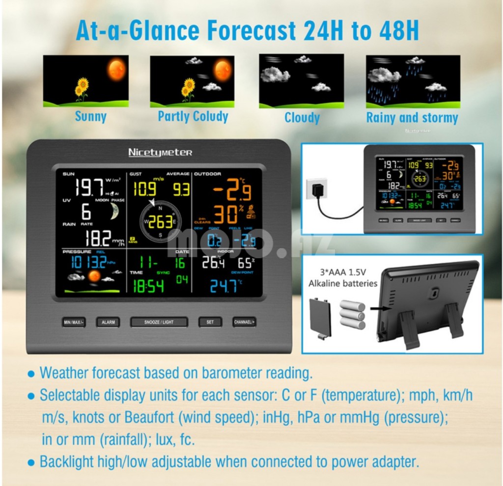 - Küləyin temperaturu və rütubət, yağış istiqaməti UV, məlumat proqnozu üçün 24 / 48 saat simsiz rəngli konsolda xəbərdarlıqlar.