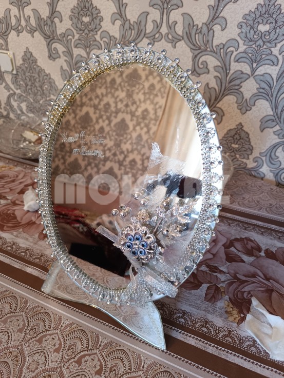 > Gözəl dizaynlı dekorativ masaüstü güzgü. Çərçivəsi muncuq və kristallarla bəzədilib, üst hissəsində süni çiçək kompozisiyası və nazar boncuğu (göz muncuğu) var.