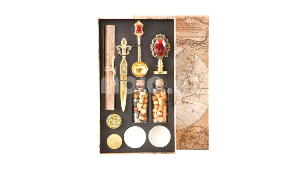 Hədiyyə dəsti qutusuna daxildir: 1 x Mum möhürü tutacağı 3 x Mum Möhür Markaları - Fleur de Lys, Kral Tacı, Celtic King Nişanı 2 x mum qranulları şüşəsi (Biri tam qızıl, biri saysız-hesabsız mum rəngləri ilə) 2 x Tealight şamları 1 x Əriyən Qaşıq 1 x Fleur de Lys Məktub Açıcısı 1 x Perqament vərəqi Qutunun ölçüsü - 24x14 sm |
