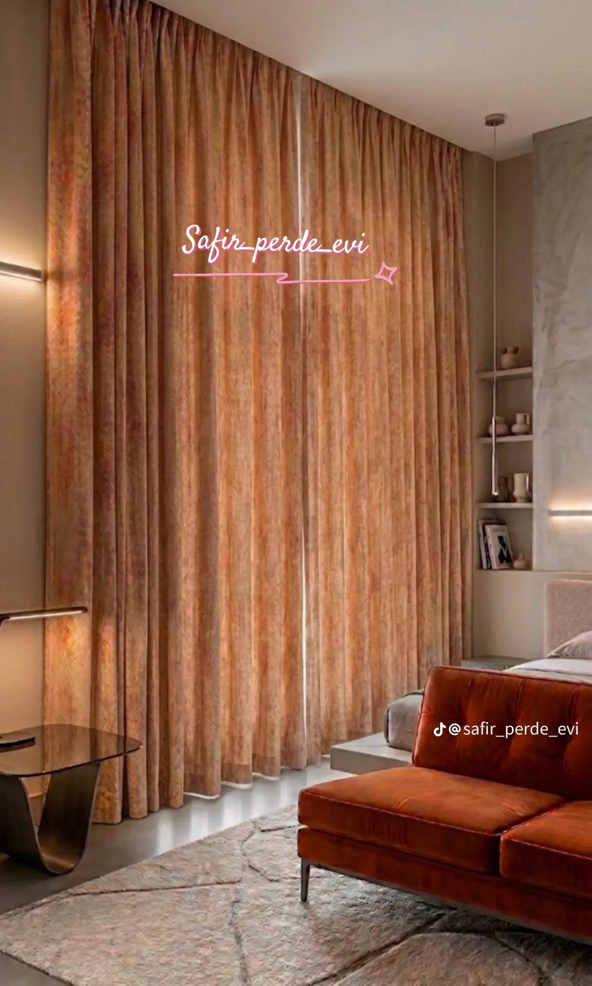 - Dərin klassik pli/qatlama tikişi, tavandan döşəməyədək ölçü ilə hündür məkan effekti.