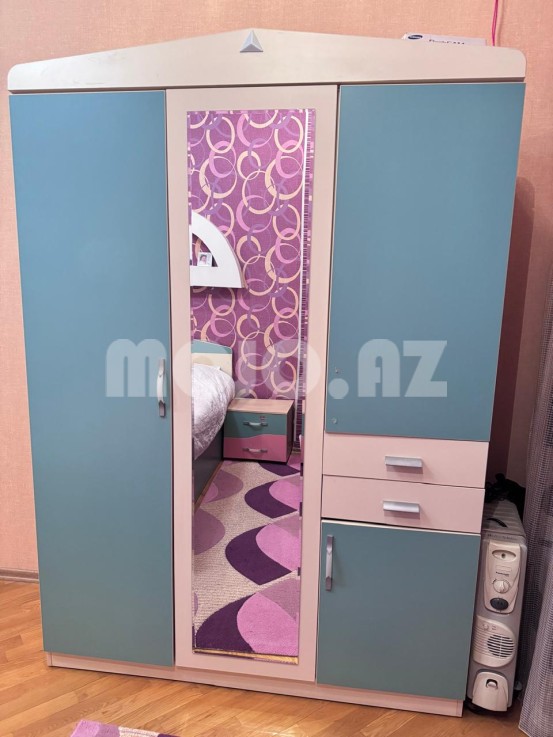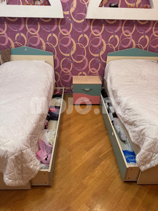 Əla vəziyyətdə gənc yataq mebel dəsti. 2 Yataq (alt hissəsi açılır), 2 Komod, 1 yazı masası, 1 böyük şkaf, 2 matras.