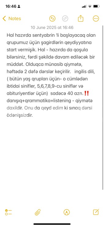 Salam☺️ Hal hazırda sentyabrin 1i başlayacaq olan qrupumuz üçün şagirdlərin qeydiyyatına start vermişik. Hal - hazırda da qoşula bilərsiniz, fərdi şəkildə davam ediləcək bir müddət. Olduqca münasib qiymətə, həftədə 2 dəfə dərslər keçirilir. ingilis dili, ( bütün yaş qrupları üçün- o cümlədən ibtidai sinifler, 5,6,7,8,9-cu siniflər və abituriyentlər üçün) sadəcə 40 azn.‼️ danışıq+qrammatika+listening - qiymətə daxildir. |